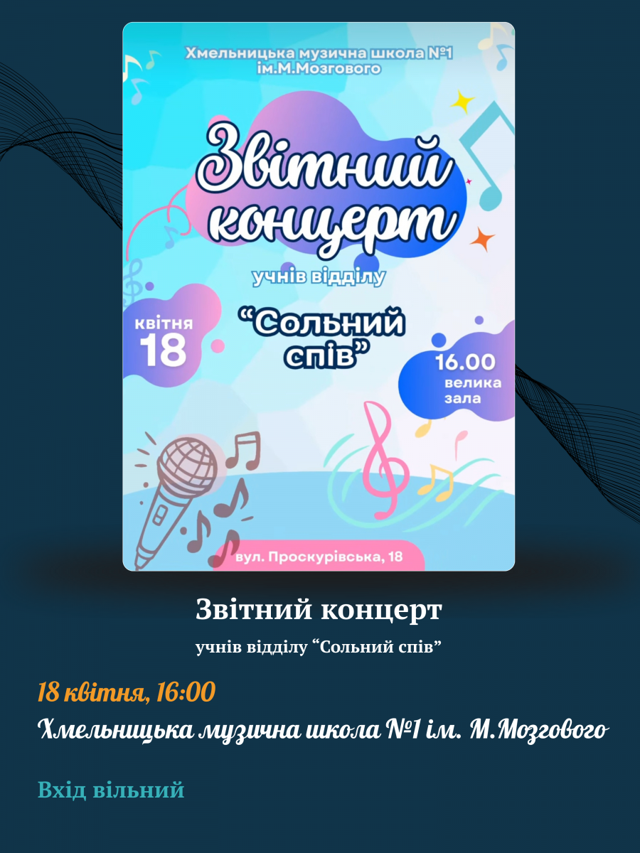 Запрошуємо відвідати звітні концерти учнів Хмельницької музичної школи №1 імені М.Мозгового 14, 15, 17 та 18 квітня.