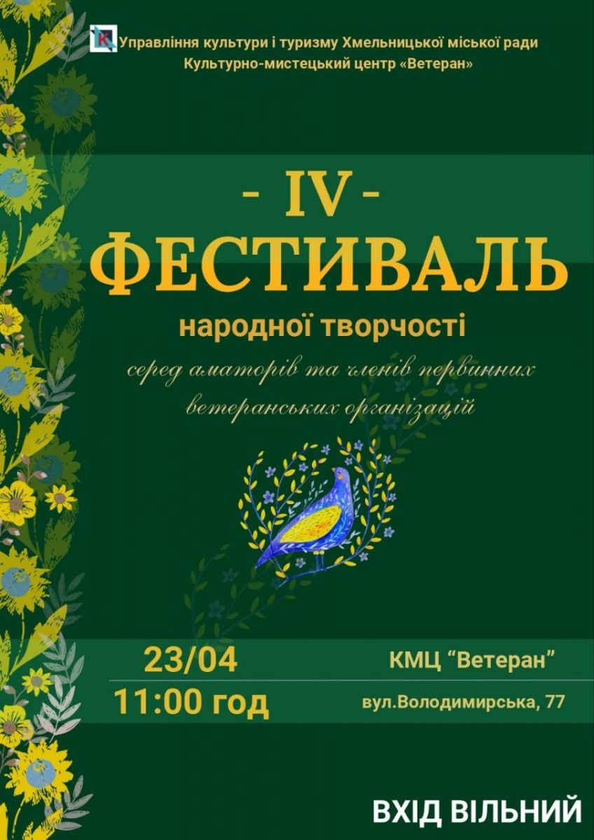 23 квітня 2026 року в культурно-мистецькому центрі "Ветеран" (вул. Володимирська, 77) пройде IV Фестиваль народної творчості серед аматорів-членів первинних ветеранських організацій Хмельницької міської територіальної громади.