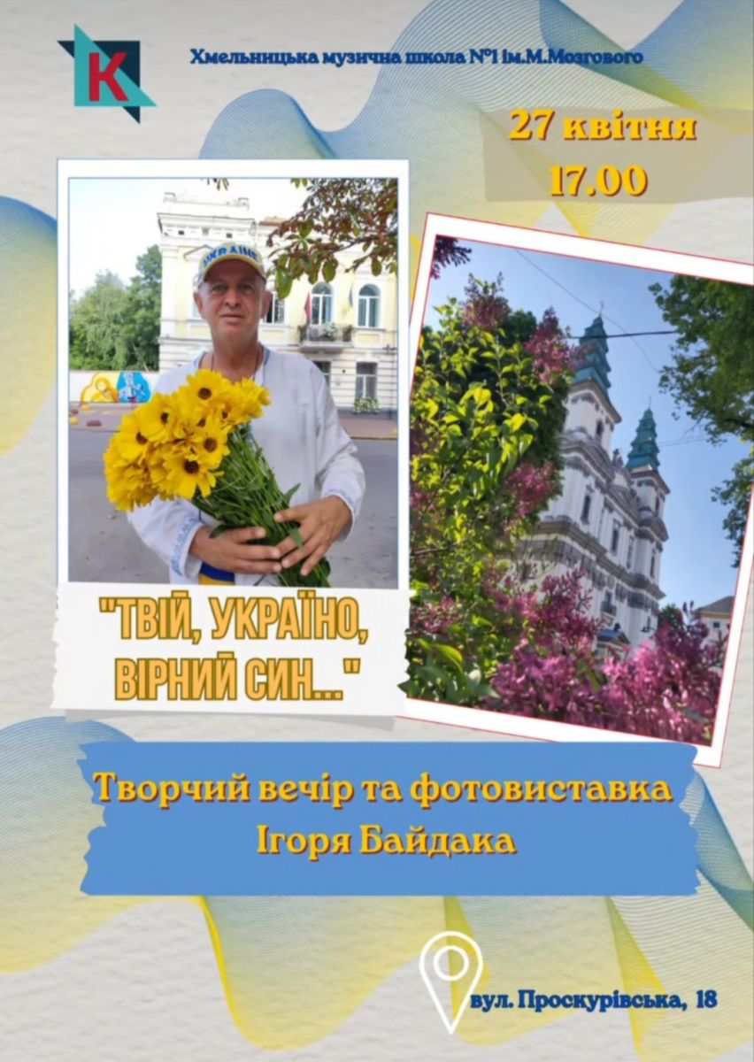 27 квітня о 17:00 в Хмельницькій музичній школі №1 імені М. Мозгового (вул. Проскурівська, 18) відбудеться творчий вечір та фотовиставка Ігоря Байдака – українського журналіста, краєзнавця, поета, фотографа, колекціонера.