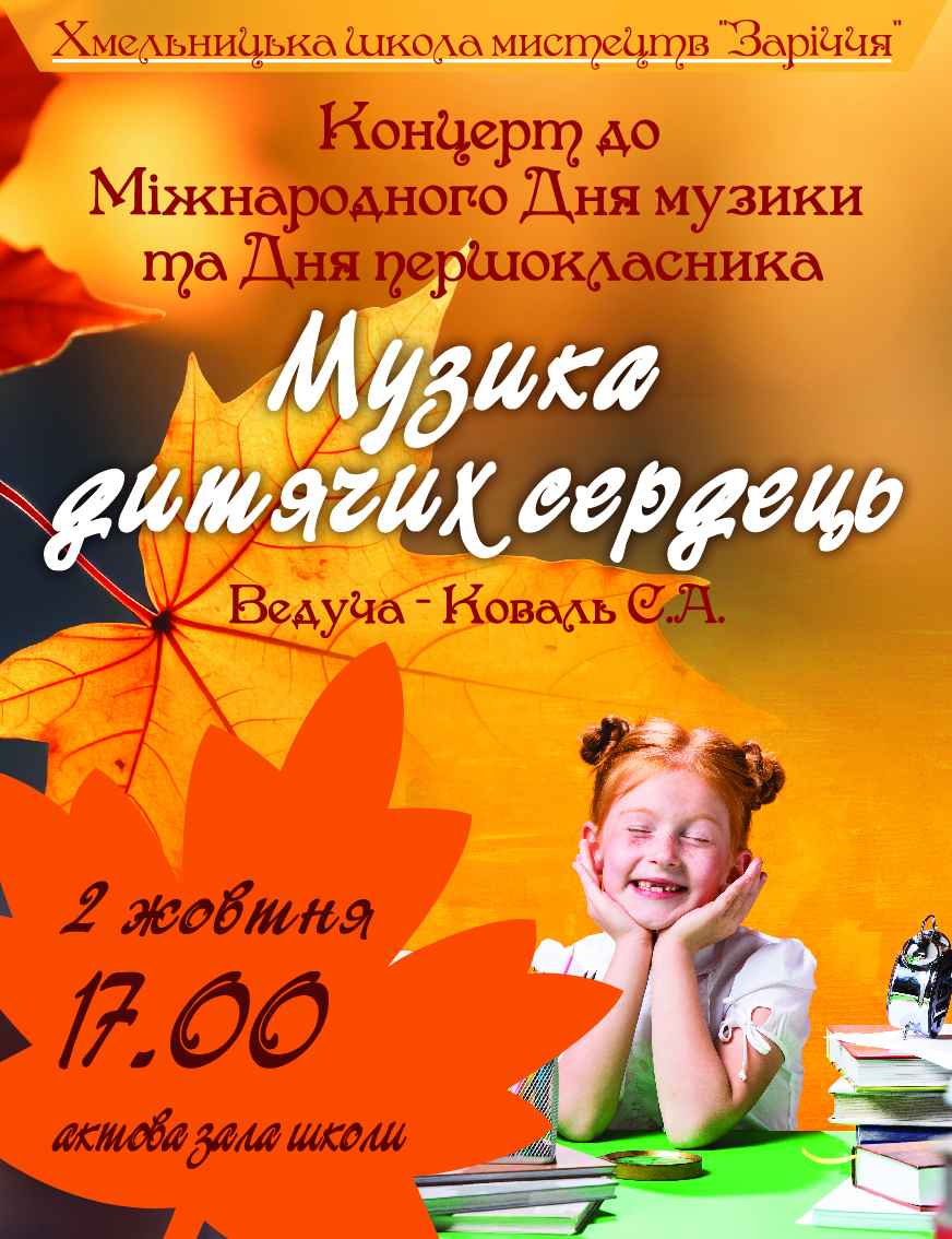 Запрошуємо всіх поціновувачів музичного мистецтва відвідати концерт учнів Хмельницької школи мистецтв «Заріччя» під назвою «Музика дитячих сердець», який відбудеться 2 жовтня о 17.00. в актовій залі приміщення школи.