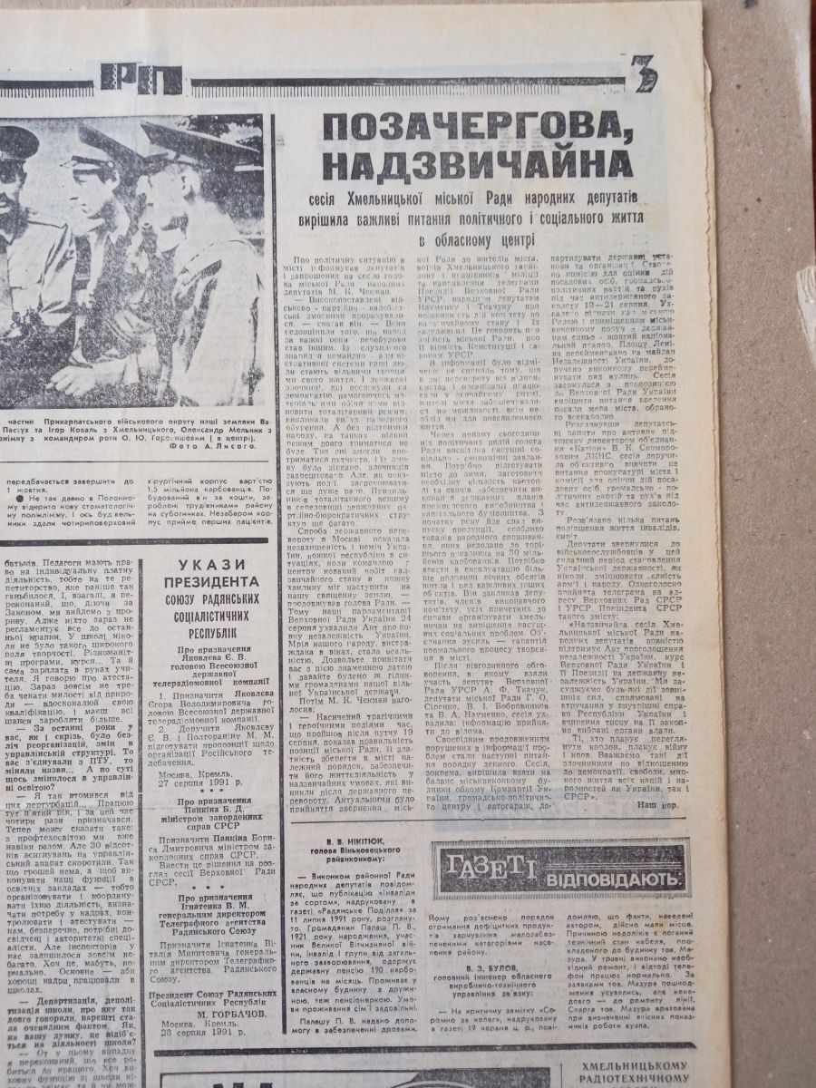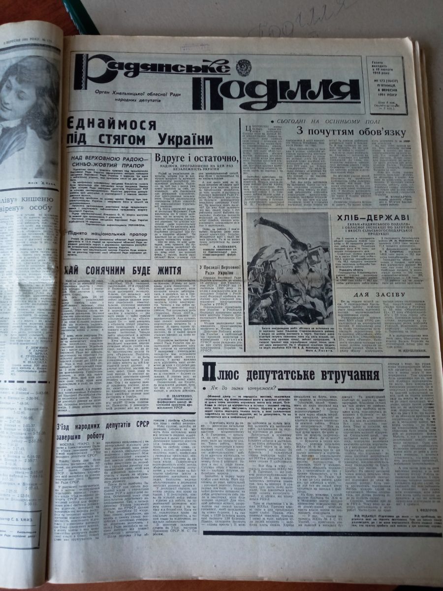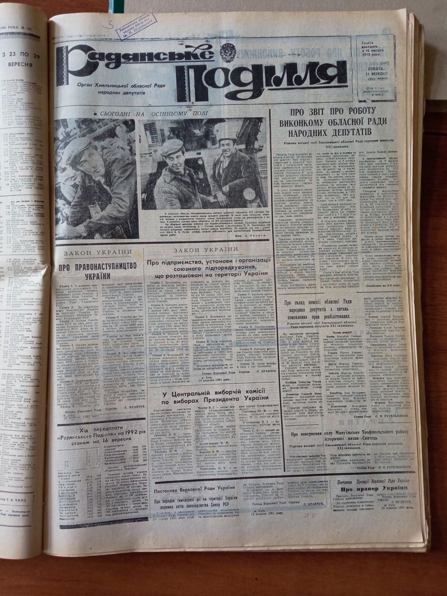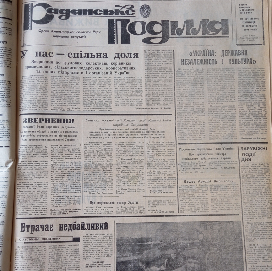 І вже аж у № 181 за 20 вересня 1991 р. розміщено замітку на першій шпальті «Про національний прапор України»: «Обласна Рада народних депутатів вирішила: Погодитись з рішенням виконавчого комітету обласної Ради від 05.09.91 № 148 про встановлення над приміщенням обласної Ради народних депутатів поруч з державним прапором національного прапора України». Голова Ради Є. Я. Гусельников». А от коли зняли прапор УРСР з обласної ради, на жаль, в газеті знайти не вдалося.