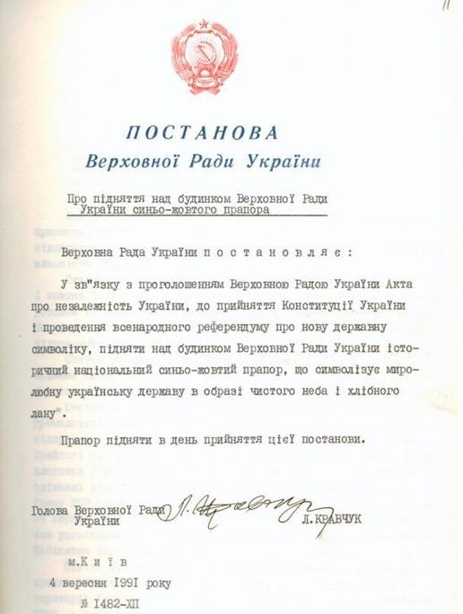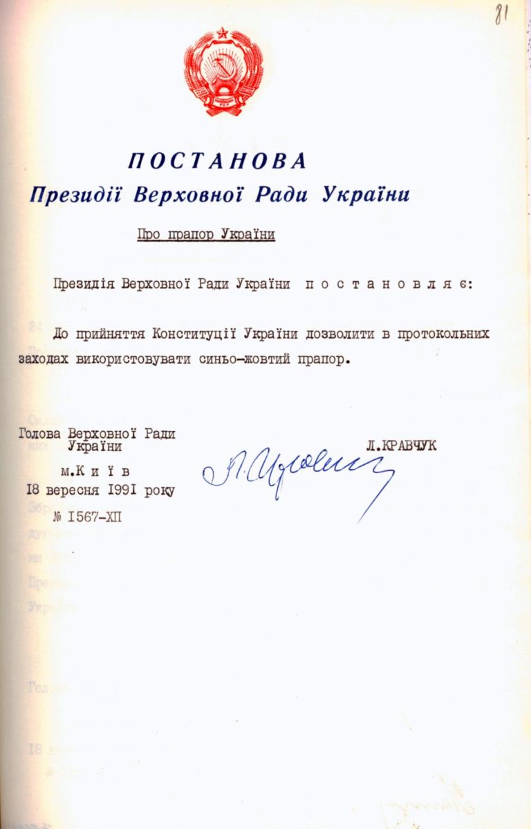 4 вересня 1991 року ВРУ після бурхливого обговорення прийняла дуже поетичну Постанову для узаконення підняття над будівлею головного керівного органу України синьо-жовтого прапора на вимогу суспільства. Подаємо її повністю: