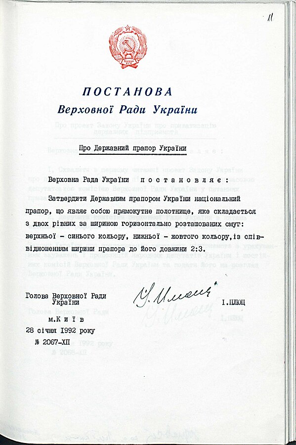 За кілька місяців, 28 січня 1992-го, ВРУ офіційно затвердила синьо-жовтий стяг Державним Прапором України.