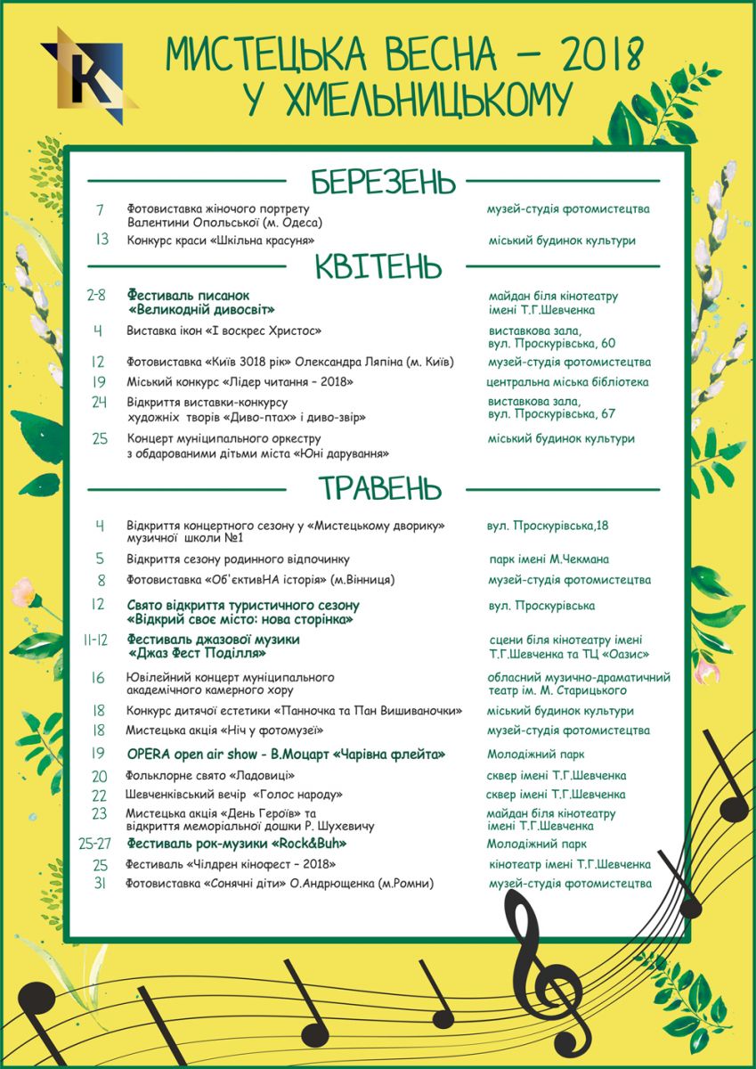 Пропонуємо календар мистецької весни – 2018 у Хмельницькому.