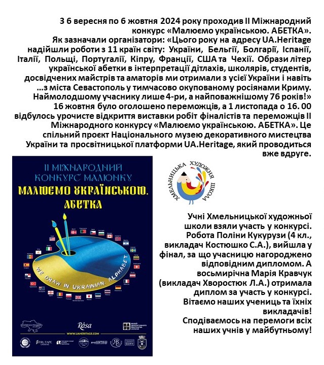 Вже вдруге Національний музей декоративного мистецтва України і просвітницька платформа UA.Heritage проводять конкурс, який одразу ж став Міжнародним – «Малюємо українською. Абетка». Широка міжнародна географія і можливість взяти участь будь-кому, хто любить українську мову, розмовляє, спілкується, пише і малює нею, зробила його популярним у різних верств і вікових категорій українців по всьому світу.