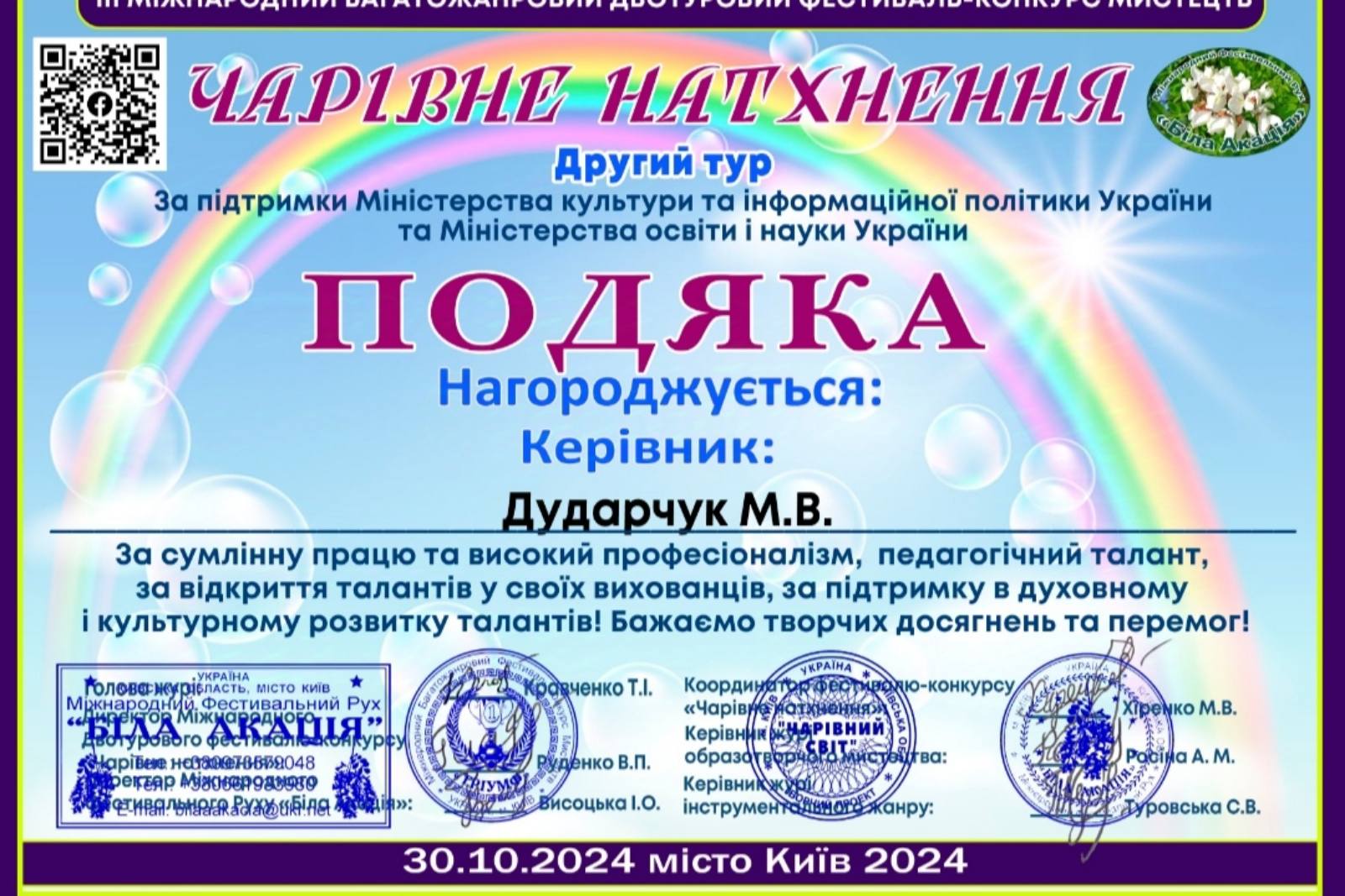 А 30 жовтня 2024 року вона стала лауреатом І Премії (номінація образотворче мистецтво, живопис) Другого туру ІІІ Міжнародного багатожанрового двотурового фестивалю-конкурсу «Чарівне натхнення». Прикметно, що конкурс відбувався за підтримки двох українських Міністерств – культури та інформаційної політики, а також освіти й науки. Є думка, що для Анни-Марії це має бути важливим, адже після закінчення школи вона повинна запланувати вступити до мистецького вишу, щоб отримати більш вагомі знання з образотворчості, а таланту, натхнення, креативності й посидючості в неї вистачить! Щира подяка викладачеві і батькам за турботу і належне навчання юного обдарування, а також самій юній художниці з побажанням подальших успіхів на мистецькій ниві!