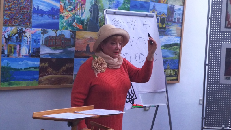 Відкрила засідання круглого столу директор музею історії міста Хмельницького Галина Барабаш. Пані Галина зазначила, що мовою символів ще за часів трипільської цивілізації люди висловлювали свій стан душі, світогляд, розуміння великих істин та таємниць буття, а кожен символ, у свою чергу, з давніх-давен приховує в собі багатогранне глибоке значення. І саме символи є значною складовою створення національної ідентичності.