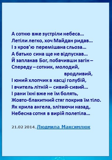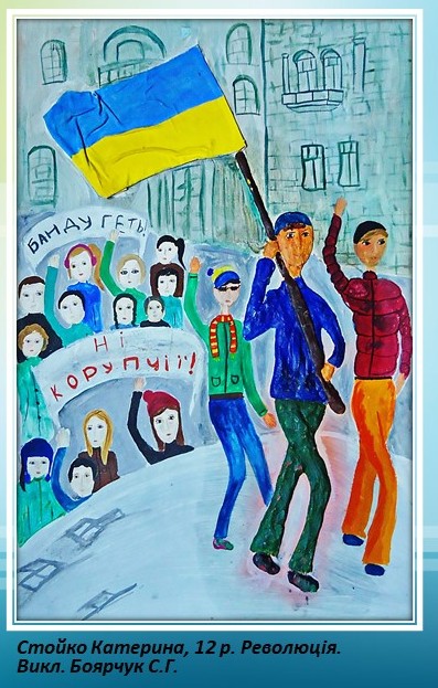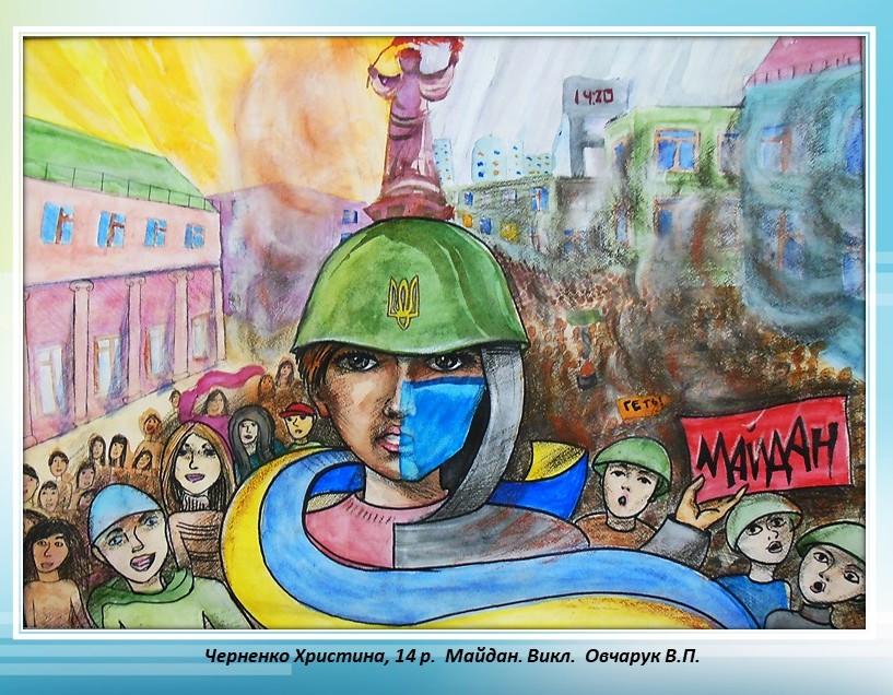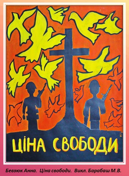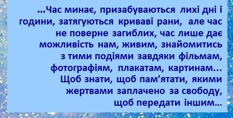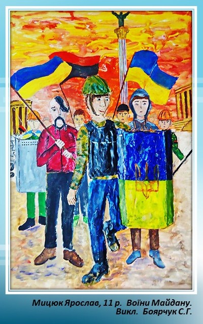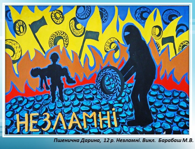 Щороку 20 лютого у Хмельницькій художній школі не лише згадують про Героїв Небесної Сотні, а й нагадують учням про тих, хто віддав своє життя за нашу свободу, за прагнення України бути достойною державою у складі незалежних європейських країн. Були в ці роки і виставки творів, і зустрічі з тими, хто був на Майданах у Києві і Хмельницькому, хто долучався до волонтерського руху, хто в міру своїх можливостей допомагав майданівцям у суворі зимові дні січня - лютого 2014 року. А ще демонструють Презентацію з розповіддю про подвиг Героїв і показують роботи учнів школи, які в різні роки після Майдану виконали плакати, замальовки, живописні і графічні твори про незабутні події часів Майдану... Нині у Виставковій залі школи діє виставка політичного і антивоєнного плакату "Переможна хода України", де серед інших робіт учнів школи демонструються і твори, присвячені буремним подвигам учасників Майдану - Героїв Небесної Сотні. Деякі з них представлено нині.