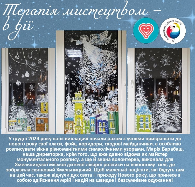 Вже не перший рік Хмельницька художня школа бере участь у цій акції «Терапія мистецтвом». З Хмельницькою міською дитячою лікарнею у школи давні міцні зв`язки, наші учні і викладачі допомагали розписувати і поліклініку, і рекреації, і палати. Велику роботу в цьому сенсі протягом кількох років проводить викладач Марія Барабаш. І навіть тепер, коли вона вже більш як півроку є в ній директором, її прагнення допомогти, підтримати, розрадити і створити красу і затишок залишаються не лише при ній, вона це продовжує робити, а й заохочує на добрі справи своїх колег і учнів. Зараз у Арт-просторі дитячої лікарні діє міні-виставка графічних творів учнів класів елементарного підрівня викладачок Марії Барабаш і Любові Хворостюк «пташки прилетіли». Ця невеличка виставочка сповнена тепла і старання юних художників, які ще тільки осягають сходинки до високого мистецтва. Проте їхні роботи несуть надзвичайно великий добрий заряд, що позитивно впливає на швидкий перебіг хвороби і сприяє одужанню маленьких пацієнтів.