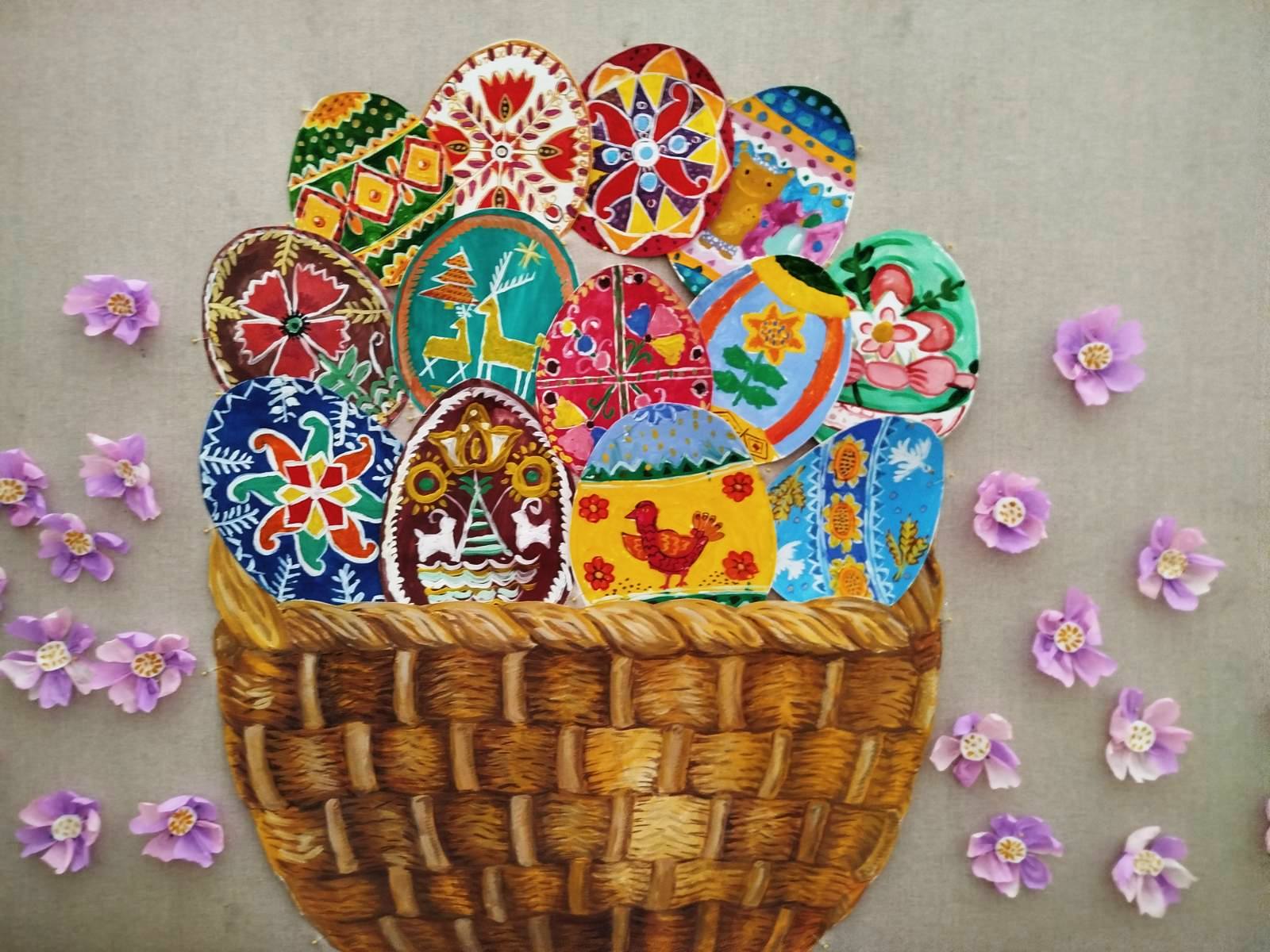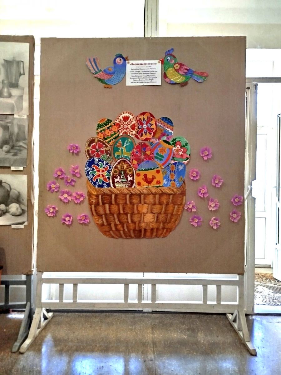 Світле і ясне свято Христового Воскресіння всі відзначають добрими вчинками, позитивним настроєм, гарними справами, віншуванням Спасителя і писанням писанок, які мають сакральний характер. У Хмельницькій художній школі і поза її стінами вже другий тиждень майстер-класи по розпису яєць – створенню писанок проводить наша викладачка – майстриня Світлана Делікатна, а викладачі школи їй допомагають. Пишуть писанки залюбки і дорослі, і діти, залишаючи власноруч розписану писанку собі на Святе Воскресіння. А є в школі учні, які зобразили велетенський кошик і вмістили в нього намальовані писанки, які вони вирішили подарувати всім, хто приходить до школи. Ці наші особливі учні, які навчаються в класі Майї Вікторівни Тимчук, малювали їх під час занять, обираючи різноманітні сюжети, гарно їх розташувавши на площині великого яйця і розмальовуючи яскравими барвами. Цим дітям з особливими освітніми потребами часом важкувато приходилось, але завдяки доброму наставнику і вмілим порадам, а часом і допомогою викладача всі вони добре справились із таким важливим завданням – намалювали і писанки, і пташечок, і навіть прикрасили стенд весняними квітами. Розмістили учні свої витвори на стенді, поставивши його у фойє одного з корпусів школи (вул. Проскурівська, 60/1) і тепер всі мають нагоду милуватись гарними писанками до Свята. Христос воскрес! Воістину воскрес!