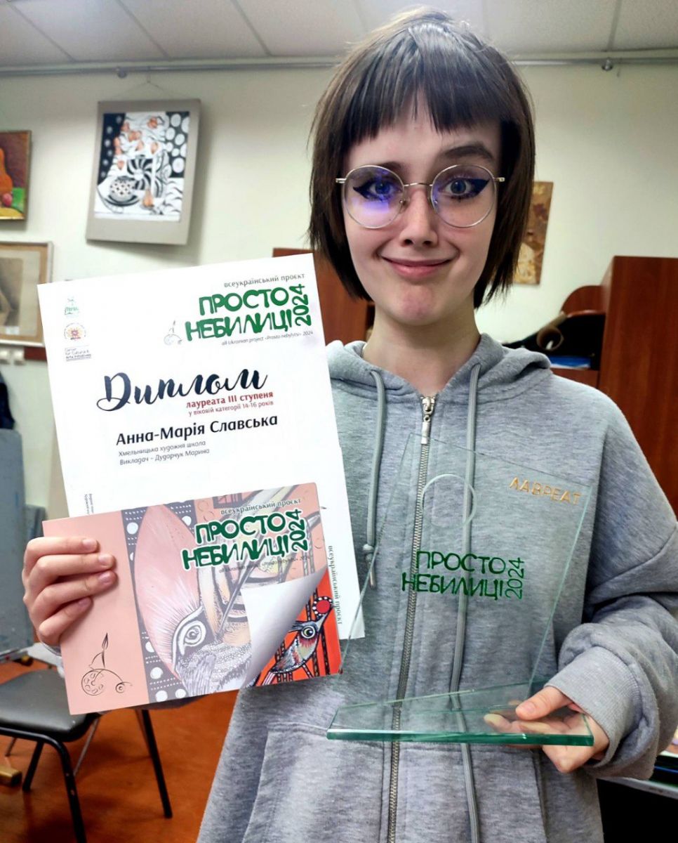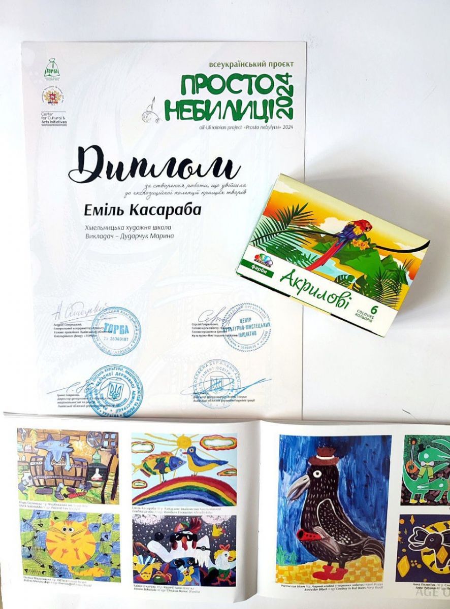 Із 717 творів, що розглядались членами журі, було відібрано 130 для експозиційної колекції. Прикметно, що Хмельницька художня школа вже не перший рік бере участь у цьому оригінальному конкурсі, де діти можуть мовою образотворчості висловити всі свої фантазії, мрії, незаангажований політ творчої думки, а також продемонструвати рівень художньої майстерності відповідно до свого віку. І в проєкті «Просто небилиці» 2024 учніХмельницької художньої школипотрапили в це щасливе число 130, отже про наших юних мистців будуть знати не лише в нашому місті, в Україні, а й за її межами. Звання лауреата ІІІ ступеня і почесну марку, що вже дев`ятий рік поспіль випускає Укрпошта , а також пам`ятний знак лауреата отримала Анна-Марія Славська (викладач Марина Дударчук), і ще три учні удостоєні дипломів учасників експозиційної колекції кращих творів. Це учениця Валентини Цноти – Анастасія Кондрацька, учень Лариси Слюсаренко Артем Базилик та учень Марини Дударчук Еміль Косараба, які крім того отримали дарунки у вигляді художнього приладдя. З усіх 130 художніх праць була утворена експозиційна колекція Всеукраїнського проєкту «ПРОСТО НЕБИЛИЦІ» 2024, з якою можна ознайомитись в Україні і за кордоном. Проте, як зазначають організатори проєкту: «Через загрози, пов’язані з російською злочинною агресією на території України, презентація результатів та виставка відбудуться в онлайн-форматі. Ознайомитися з експозицією можна буде у віртуальній галереї Центру Культурно-Мистецьких Ініціатив та Львівського обласного благодійного фонду «ТОРБА», а також у фізичних виставкових просторах галерей-партнерів у рамках їхнього графіку роботи, враховуючи стан небезпеки в Україні. За межами України презентації відбуваються згідно з графіком виставкової активності галерей-партнерів». Програма й актуальна інформація стосовно Проекту — на офіційних сайтах координатора Проекту lvivtorba.com та організатора Проекту artcenter.org.ua