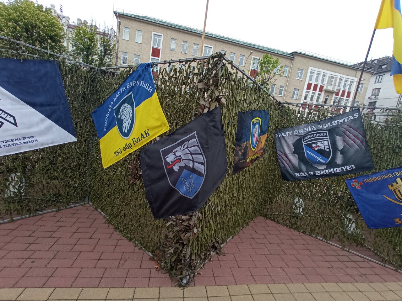 Ще одна експозиція демонструє прапори військових частин, котрі нині діють на території Хмельницької територіальної громади і звитяжно боронять державний суверенітет і цілісність України від рашистського агресора.