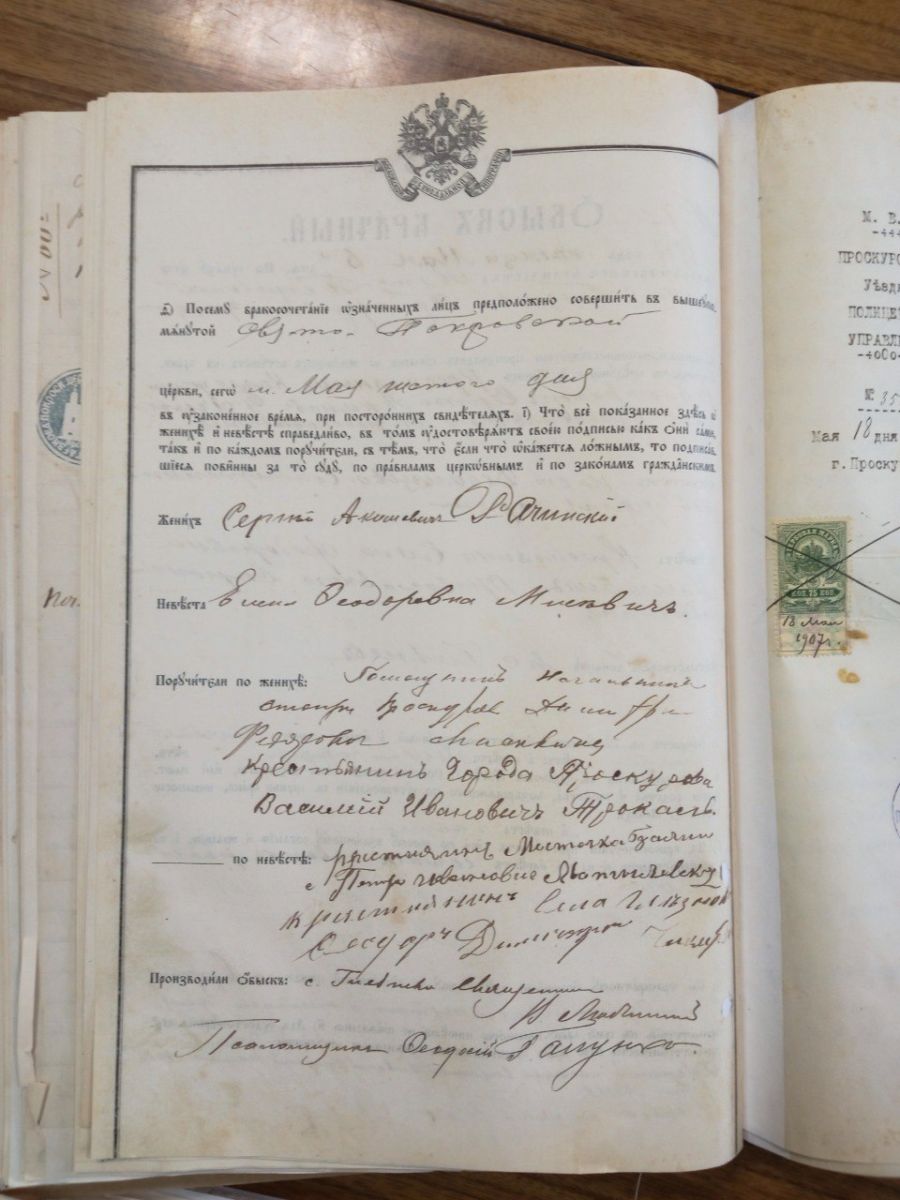 Нещодавно нам вдалося відшукати ще один цікавий документ у фондах Державного архіву Хмельницької області, котрий суттєво доповнює таємницю вибору професії і першого місця праці Костя Місевича. У «Шлюбному обшуку №7 Свято-Покровської церкви села Глезнова Проскурівського повіту» від 6 травня 1907 року йдеться про узгоджений шлюб у цій церкві між рідною сестрою Костя Місевича, двадцятичотирьохрічною селянкою Оленою Федорівною Місевич (на сім років старша від Костя Місевича – авт.) та двадцятип`ятилітнім селянином колезьким реєстратором Сергієм Якимовичем Рачинським, мешканцем станції Дебальцеве Катеринославської залізниці. В документі зазначено, що поручителем від нареченого виступив помічник начальника станції Проскурів Дмитро Федорович Місевич, себто старший рідний брат Костя і Олени Місевичів. До речі, за даними хмельницького краєзнавця Миколи Новицького, котрі ще потребують подальшого вивчення (публікації в тодішній центральній пресі закордонних бібліотек, до яких нині доступ обмежений), в червні 1914 року начальник станції Проскурів(!) Дмитро Федорович Місевич був указом російського імператора удостоєний звання «почесний громадянин».