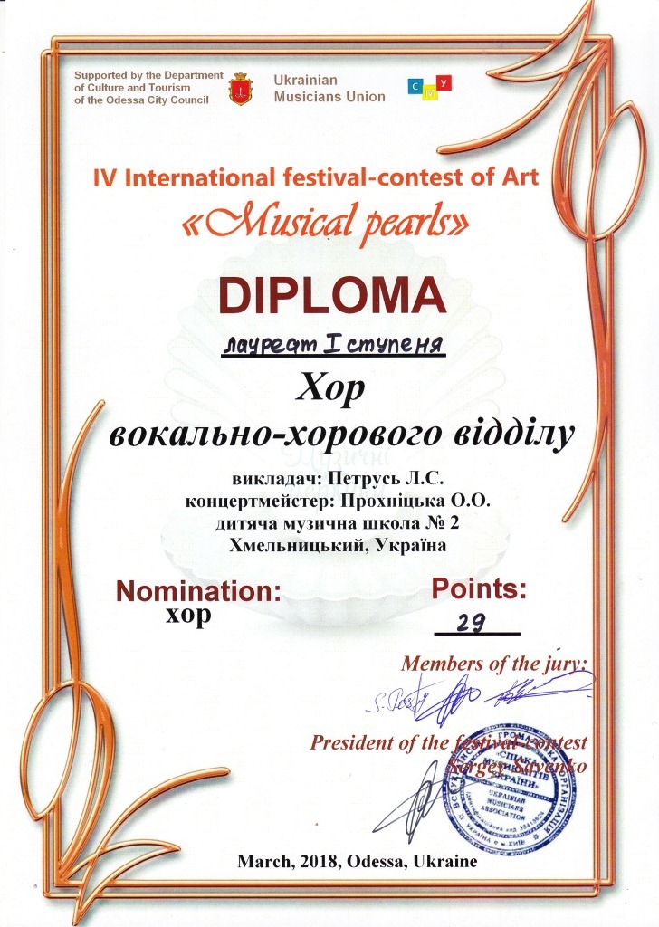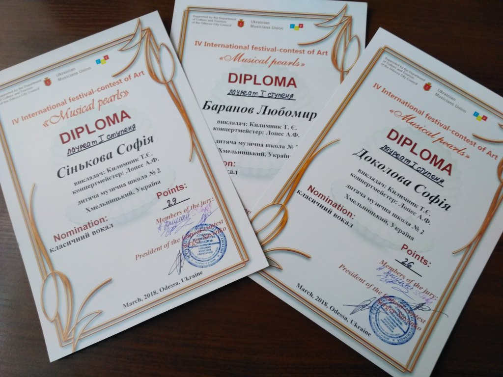 Авторитетне журі, яке оцінювало виступи учасників фестивалю-конкурсу, відмітили високу професійну та виконавську майстерність виконавців Хмельницької дитячої музичної школи №2. В усіх номінаціях, де брали участь учні нашої школи, отримано перші місця: хор вокально-хорового відділу (керівник Лілія Петрусь, концертмейстер Олена Прохніцька) та учні класу сольного академічного співу викладача Тетяни Килимник – Баранов Любомир, Доколова Софія та Сінькова Софія.