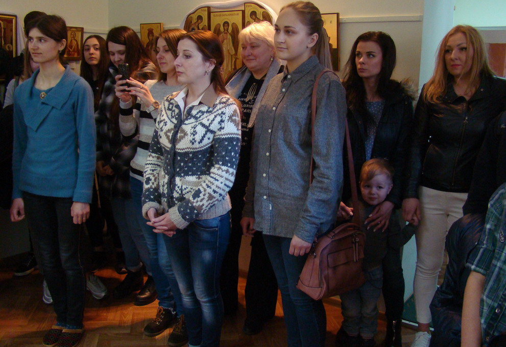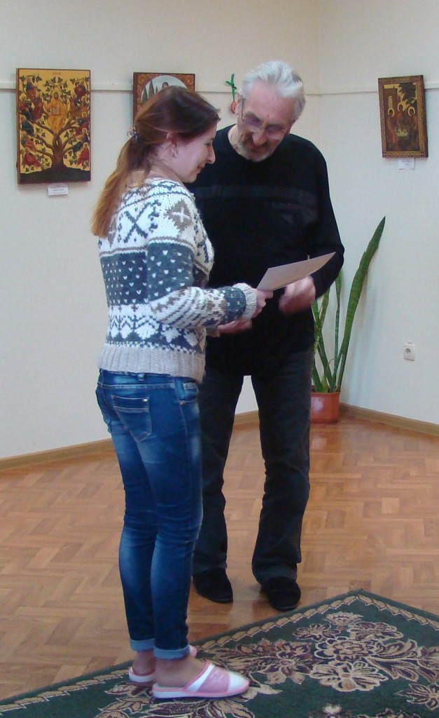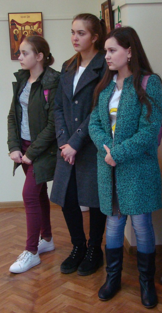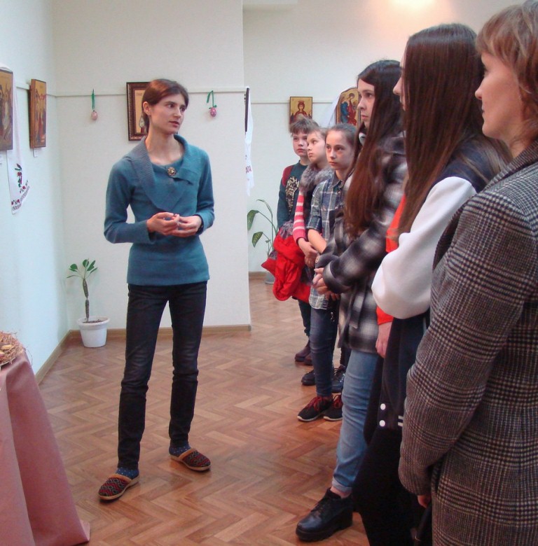 Викладач Войтюк Ольга Сергіївна ознайомила відвідувачів виставки із сюжетами ікон, що експонуються у виставковій залі школи. Найбільш вражає глядачів виваженість кольорових плям, які творять внутрішню динаміку, сприйняття образу Святого. Кожна ікона – це жива вишукана сакральна мелодія духу.