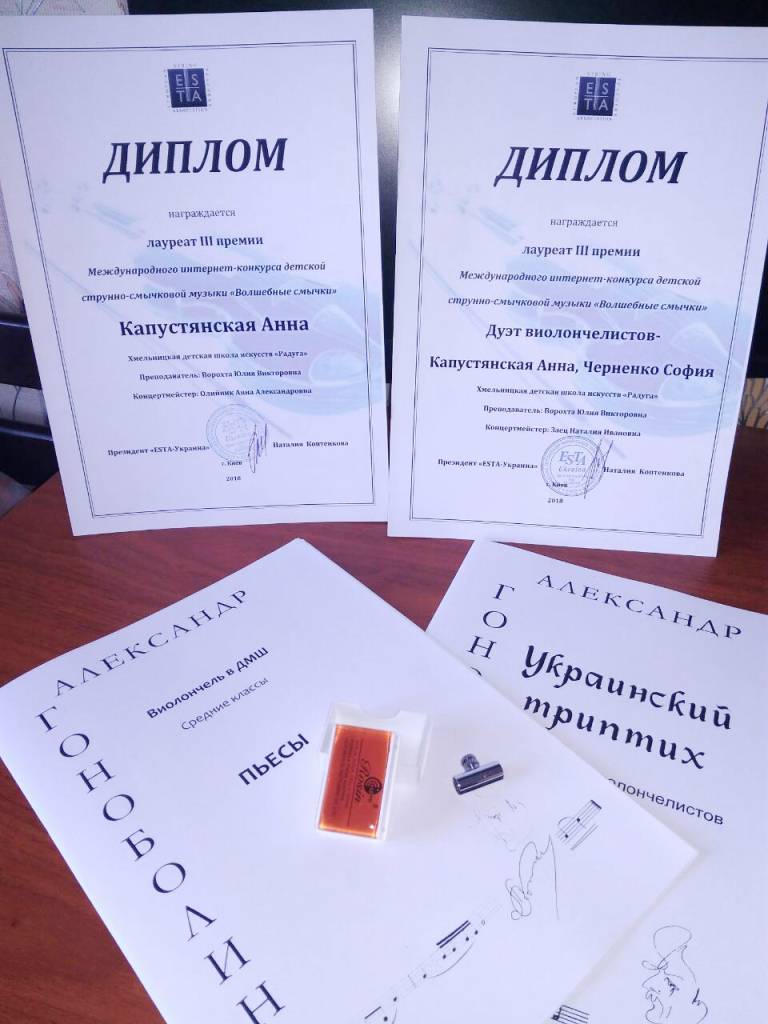 Юні музиканти – учні класу віолончелі ХДШМ "Райдуга" (викладач Юлія Ворохта, концертмейстер Анна Олійник) продемонстрували достойний рівень виконавства, здобувши диплом ІІІ ступеня у номінації "віолончель" – Капустянська Анна та дует віолончелістів у складі Капустянської Анни та Черненко Софії – ІІІ місце у номінації "ансамблі малих форм".