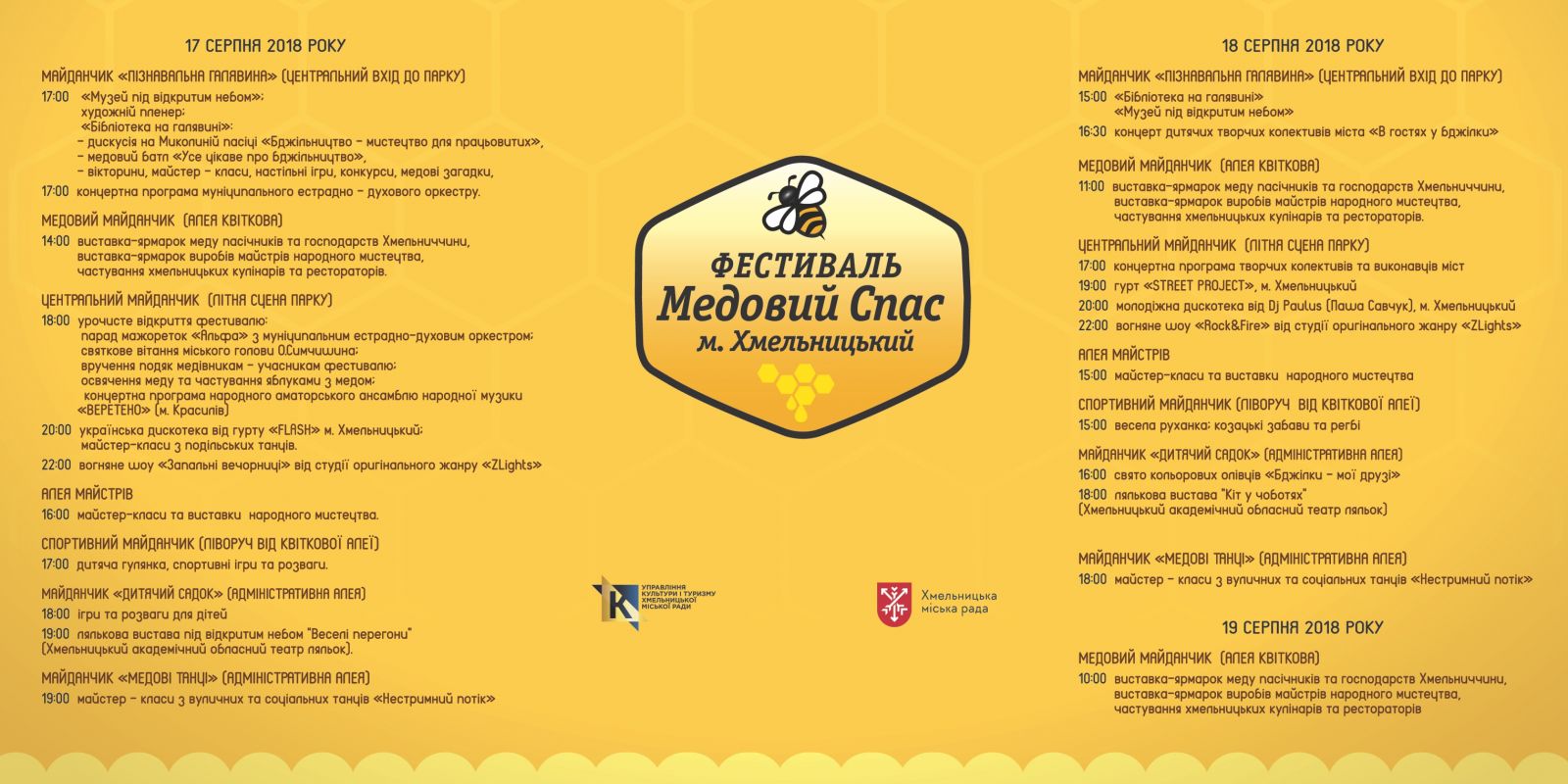 Три дні хмельничани матимуть змогу провести у царстві меду, і кожний, хто його відвідає, отримає естетичну насолоду, відпочинок і розваги, змістовну інформацію та придбає корисні для здоров’я продукти. Програма фестивалю насичена різноманітними заходами, концертами та майстер-класами. Родзинкою має стати ярмарок меду та продуктів бджолярства за участю бджолярів з Подільського краю та України.