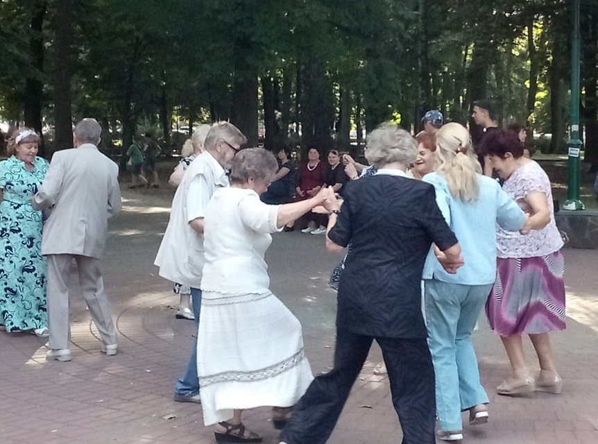 У неділю, у сквері ім. Т. Г. Шевченка, відбувся один з небагатьох заходів, спрямованих на проведення активного дозвілля людей літнього віку на свіжому повітрі. Починаючи з 18.00 на пенсіонерів чекали музичні композиції та танці їхньої юності та молодості. Охочих закружляти у танку виявилось багато, не зважаючи на те, що така програма цьогоріч проводилась вперше, адже з часу, коли в цьому парку грав духовий оркестр, минуло майже півстоліття. Активним ініціатором заходу виступила голова обласної громадської організації «Діти війни» Тетяна Володимирівна Галушка. На її пам’яті, як і її ровесників – корінних хмельничан, з цим місцем пов’язанні спогади минулого – частина життя.