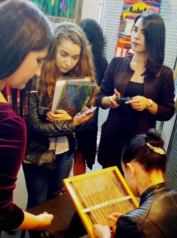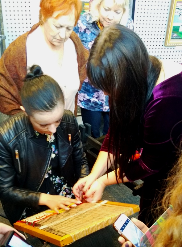 Квітами та найкращими побажаннями привітали майстриню учасники презентації – студенти факультету початкового навчання та філології Хмельницької гуманітарно-педагогічної академії. Для майбутніх вчителів майстрині провела майстер-клас з художнього ткацтва на власноруч виготовленому ткацькому міні-верстаті. Студенти зацікавлено дізнавалися тонкощі ткання, скрупульозно вникали у деталі створення візерунків.