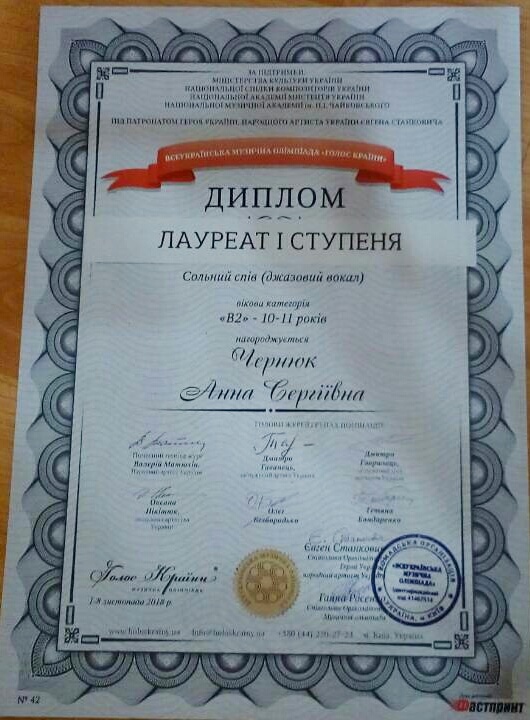 У Києві 3-4 листопада змагалися учасники Всеукраїнської музичної олімпіади "Голос країни" у номінації "сольний спів (джазовий вокал)". Так, учениці викладача Ірини Красовської Чернюк Анна отримала І місце, а Черняєва Вірсавія - ІІ місце.