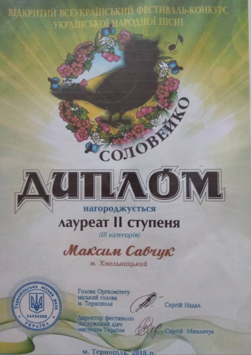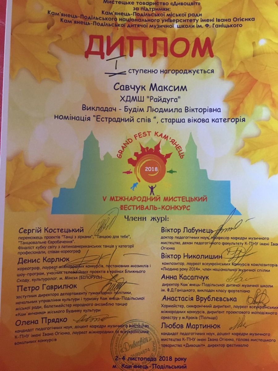 Учень класу сольного співу викладача Людмили Будім Савчук Максим виборов І місце у Міжнародному фестивалі-конкурсі "Grand - Fest Кам'янець", який проходив 2-4 листопада умісті Кам'янці-Подільському.