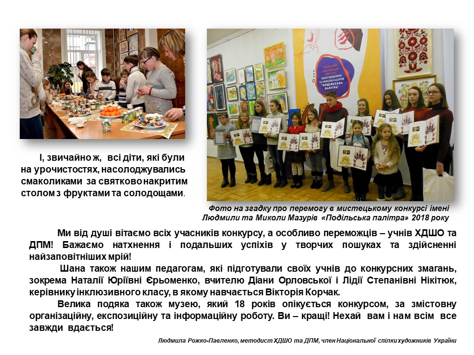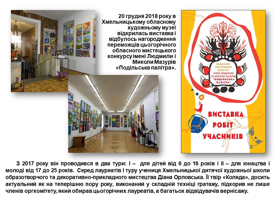 20 грудня у Хмельницькому обласному художньому музеї відкрилась виставка і відбулось нагородження переможців цьогорічного обласного мистецького конкурсу ім. Миколи та Людмили Мазірів "Подільська палітра".