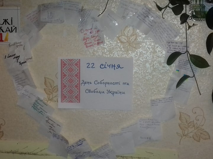 По завершенню уроку учні створили ланцюг єдності – на паперах писали побажання нашій славній Україні (українцям), який з’єднали в одне ціле серце.