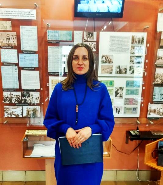 Завідувач музею ВітаБаранюк ознайомила школярівіз трагічними подіями окупації Проскурова, розповіла про героїчне визволення обласного центру від нацистів, а також наголосила, що напередодні 75-ї річниці визволення нашого міста від нацистів ми висловлюємо всенародну повагу і вдячність усім захисникам Батьківщини, які в роки Другої світової війни боролися за свободу і мир на рідній землі, та тим Героям, які сьогодні ціною власного життя захищають незалежність та територіальну цілісність України.