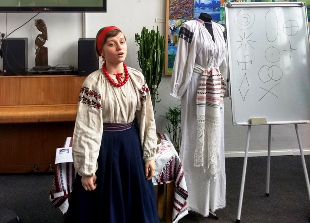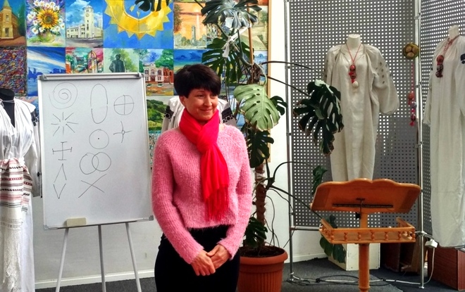Гостей привітала директор музею Галина Барабаш. Пані Галина запропонувала товариству пізнавальний екскурс у таємниці прадавньої української символіки. Наші предки свої знання про всесвіт, уявлення про його триєдину природу: Праву, Яву, Наву, свої відчуття виражали стрункою системою символів та кольорів. Ці символи, як сакральна мова світотворення та світоладування, зображувалися на одязі (вишивка) та культових предметах, посуді, писанках (розпис) та впродовж тисячоліть передавалися з роду в рід, слугуючи джерелом знань та оберегами.