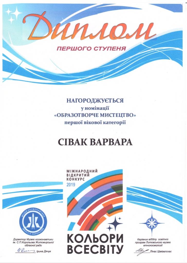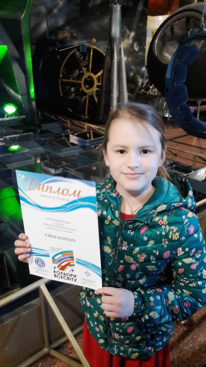 Учениця художнього класу Хмельницької дитячої школи мистецтв «Райдуга» Сівак Варвара (викладач Зоя Сніцар) отримала І місце Міжнародного конкурсу художньої творчості «Кольори Всесвіту» у номінації «образотворче мистецтво».
