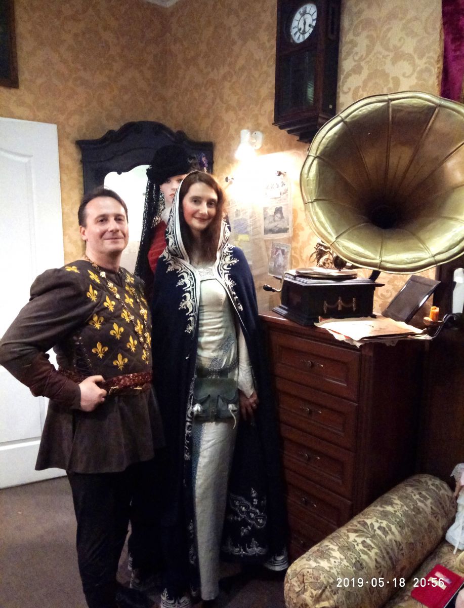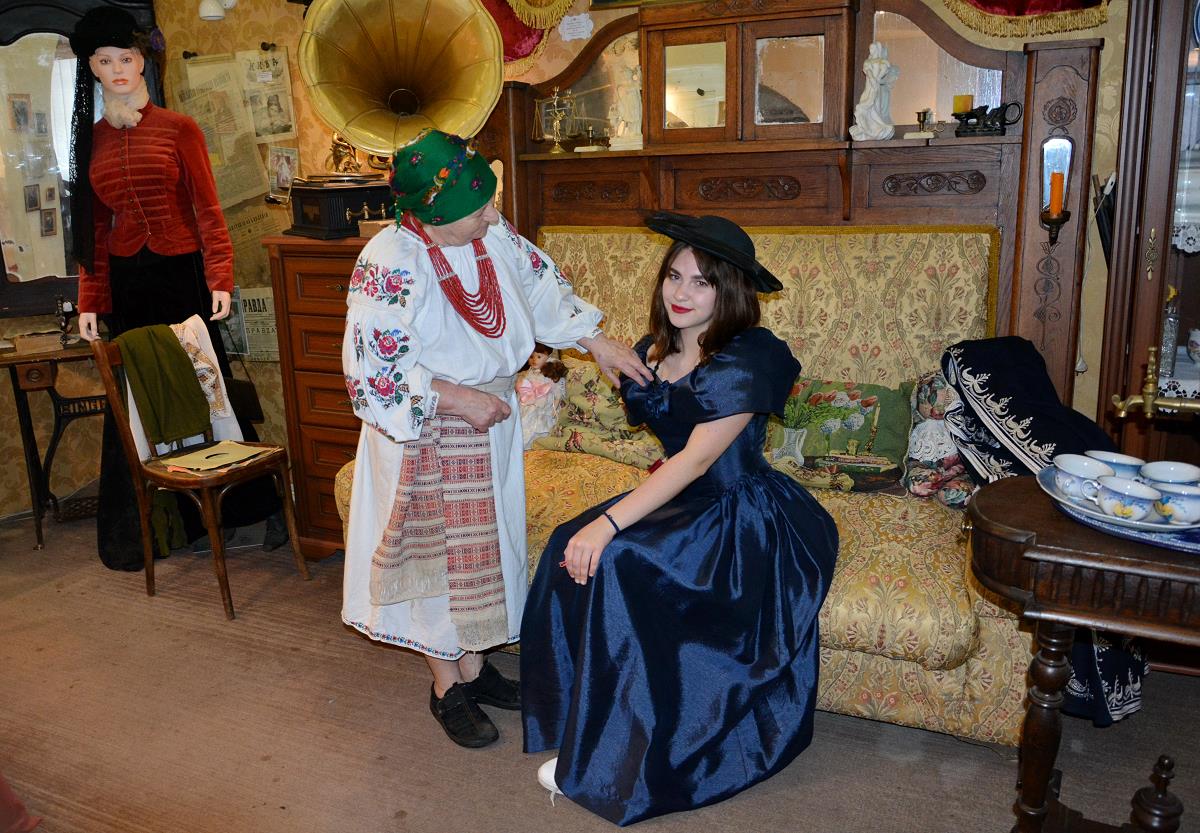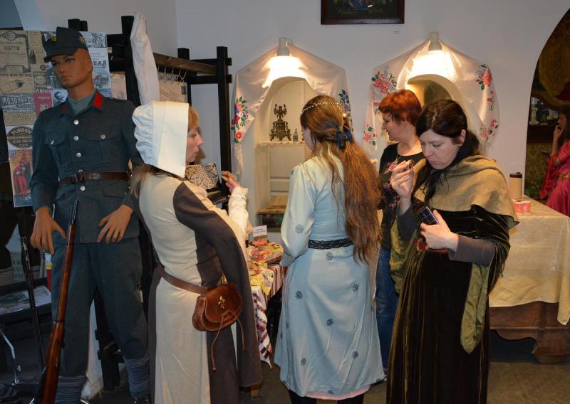 Просто з порогу гості вечірки фактично занурювалися в загадкову атмосферу історичної реконструкції, адже в залу імпровізованого ілюзіону вони отримали чудову нагоду увійти вже в особисто обраному вбранні, яке пропонували їм гостинні музейниці, й самі вбрані в костюми різних епох. Зокрема, науковий співробітник музею Оксана Собко зустрічала гостей вечірки у реконструкції середньовічного хангероку скандинавського типу, який у певний період часу носили і плоскирівчанки. Цей історичний костюм ви можете бачити щодня на манекені в експозиції музею.