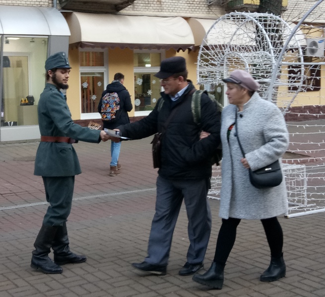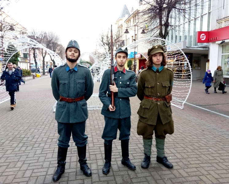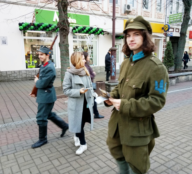 А на Проскурівській волонтери музею, активісти товариства збереження історії України МГО «Січ» влаштували флешмоб – історично-військову реконструкцію: у військових одностроях вояків і козаків Армії УНР роздавали запрошення на нову атмосферну екскурсію та закликали хмельничан вивчати історію рідного міста.