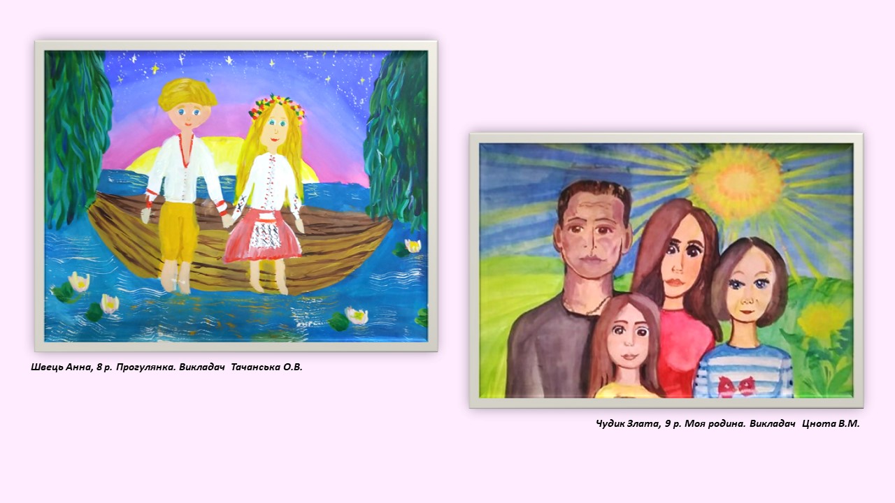 Тема родинного затишку, добрих стосунків батьків і дітей, любов синів і дочок до мами, тата, старшого покоління родини, сестер і братів актуальна завжди, надто зараз, коли батьки працюють і мало часу приділяють дітям, а ті більшість вільного часу зайняті своїми гаджетами. Тому надзвичайно відрадно сприймати роботи, де родина разом подорожує, відпочиває, старші піклуються про молодших і навпаки. А ще приємно бачити, що серед представлених робіт багато творів, які розповідають про дружні стосунки між дітьми, про спільні прогулянки, розваги. У вас, шановні, є нагода познайомитись з такими творами учнів ХДШО та ДПМ і зробити власні висновки.