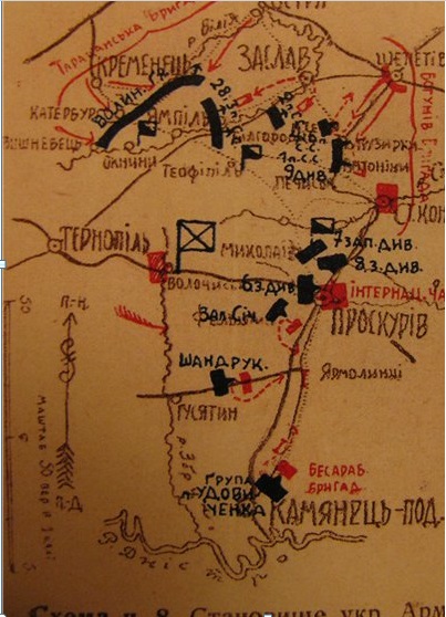6-та дивізія відважно атакує Проскурів і після гарячого бою захоплює його. Большевики уперто оборонились, великий підтрим їм давали 3 бронепотяги, що стійко боролися з нашою артилерією. Настирливість та енергія 6-тої дивізії, а теж і загроза Проскурову з боку 8-ої дивізії вирішили справу. В наші руки дістається велика здобич: 8-ма дивізія не встигла взяти безпосередньої участи в бою. Зосередилася вона на північ від Проскурова, фронтом на схід.