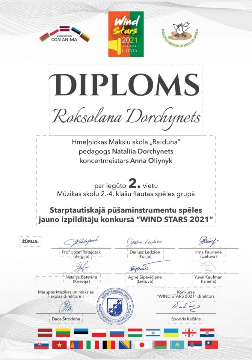 4-6 березня 2021 р. у м. Рига (Латвія) відбувся ІІ Міжнародний конкурс молодих виконавців на духових та ударних інструментах "Wind Stars - 2021" серед учнів мистецьких та спеціалізованих музичних шкіл. Серед 350 учасників-солістів з 22 країн, учениця Хмельницької дитячої школи мистецтв "Райдуга", 9-ти річна Дорчинець Роксолана виборола ІІ місце.