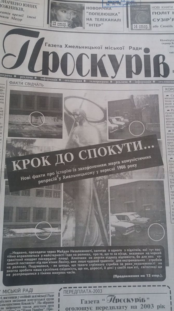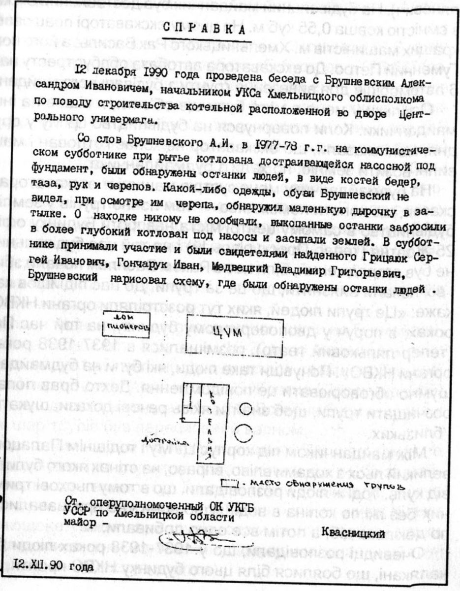 В офіційному документі – листі за підписом начальника управління КДБ О. І. Денищика на ім.`я голови міської Ради народних депутатів І. В. Бухала від 31 грудня 1990 р., оприлюдненому Б. Теленьком 8.11.2002 р. в газеті «Проскурів» №№ 91-92, повідомляється: «Управлением КГБ по Хмельницкой области проведены дополнительные мероприятия по расследованию фактов обнаружения и перезахоронения остатков трупов людей, обнаруженных в 1966 году в период строительства универмага в г. Хмельницком. В частности установлено, что в сентябре 1966 года, при проведении земельных работ под котлован универмага, ковшом экскаватора была вскрыта яма-могила, в которой обнаружено значительное количество остатков трупов людей. В течение нескольких ночей останки вначале в гробах (до 20), а затем открытым способом на самосвалах вывозились на территории старого кладбища по ул. Чехова и сгружались в специально подготовленные траншеи, длиной по 30 м, шириной до 2 м и глубиной – до 1,5 м, после чего бульдозером эти траншеи засыпались. После 1966 года, в связи с расширением территории КАТП № 222801 горкомунхоза за счет кладбища, указанное место перезахоронения останков оказалось в пределах площади хозяйственного двора данного предприятия. Оно заасфальтировано и находится в районе силовой подстанции …. На него указали очевидцы тех событий, работник КАТП № 222801…(прізвище не опубліковане).