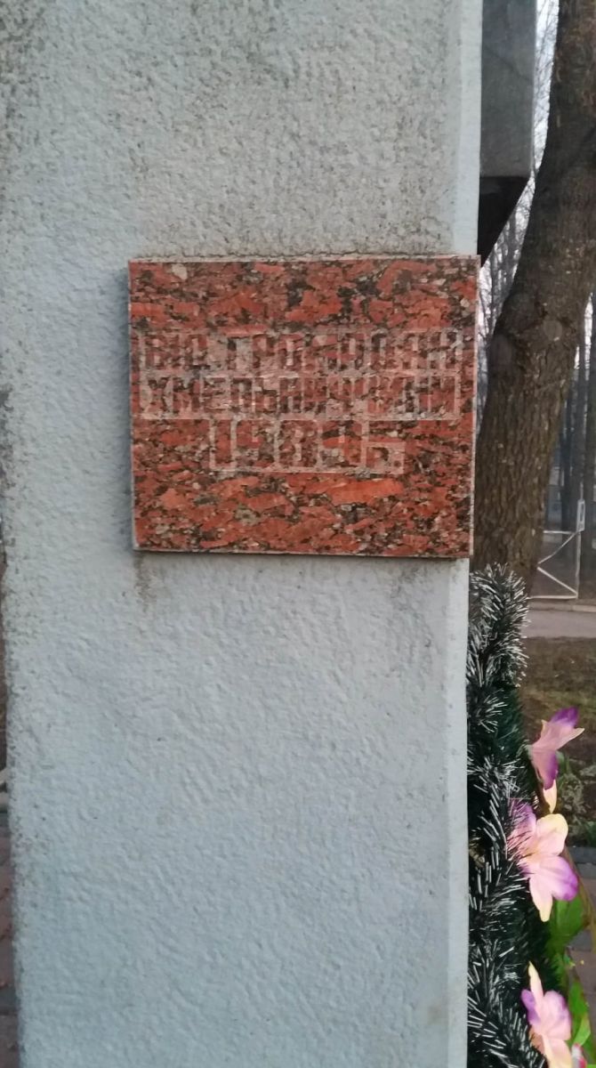 Про масові захоронення жертв комуністичних репресій 1937-1938 років на території м. Хмельницького: в мікрорайоні Заріччя, за старим кладовищем, що на розі вулиці Степана Бандери та проспекту Миру, та на території старого міського кладовища по вулиці Кам`янецькій в районі вулиць Чехова і Толстого.