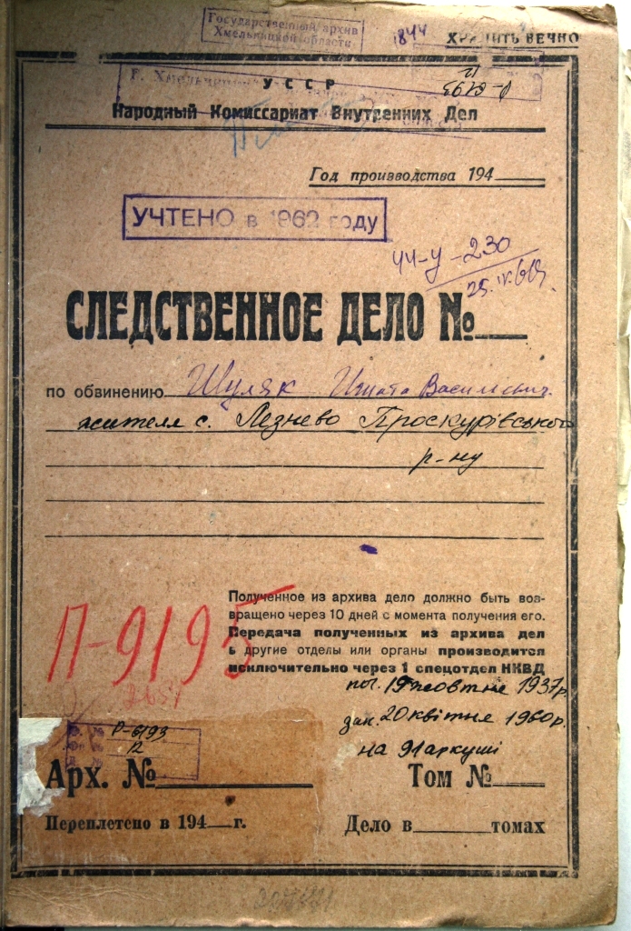 Публікуємо історію трагічної долі нашого земляка Шуляка Гната Васильовича. Гнат Шуляк заарештований 18 жовтня 1937 року. Народився 1887 року в с.Лезневе Проскурівського району, Кам’янець-Подільської області. Проживав також у с.Лезневе. У довідці про склад сім’ї, виданої Лезневською сільрадою, вказані: дружина Шуляк Гапка1890 р. н., сини: Петро -1914 р. н., Михайло -1919 р. н., Федір – 1921 р. н., Степан -1923 р. н., Ганна - 1929 р. н. (Родичі надали документи про ще одного сина Миколу -1910 р. н.). Соціальний стан – «крепкий» середняк, родина мала найманих працівників. Освічений. В 1910 році їздив на заробітки у США. У 1914 році повернувся на батьківщину в с. Лезневе. Під час Першої світової війни в армію не був мобілізований, бо був єдиним сином у батьків, служив вільнонайманим на транспорті. У 1918 році при правлінні Павла Скоропадського служив у гетьманській охороні. У 1919-1920 роках служив у різних військових частинах армії УНР. На службі в петлюрівській армії служили також односельці Гнатка - Веретко Іван та Пахута Григорій.