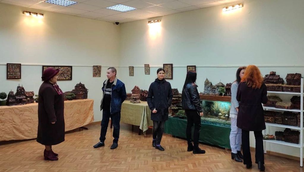 Першу мініатюрну церкву митець створив у 2020 році та подарував її своїй матусі до ювілею, як автор каже: хотів подарувати подарунок, який зробив власноруч. Надихнувшись своєю першою роботою, Євген і надалі продовжував виготовляти мініатюрні церкви та замки, які представлені у стінах виставкової зали «Нікош». Також у залі можна ознайомитись із Гербом, який подарували Євгену його колеги із Волино-Подільського геральдичного товариства.